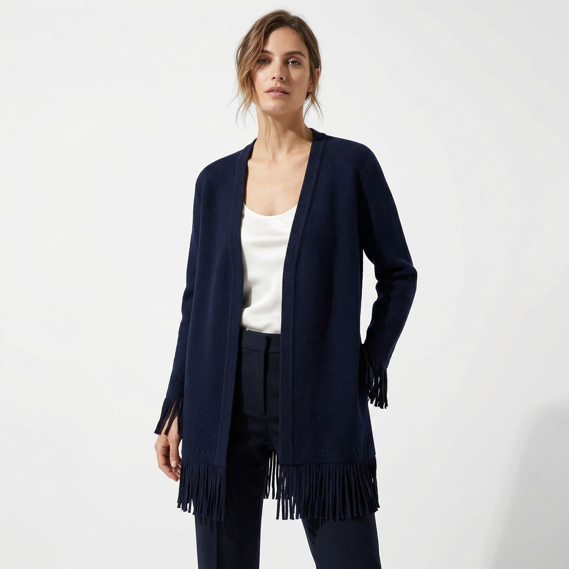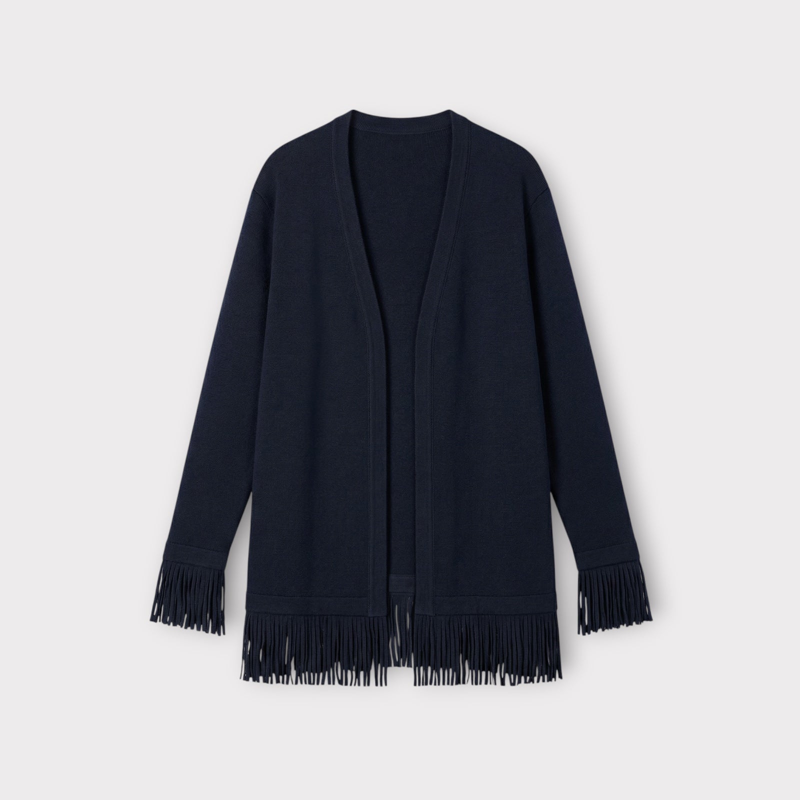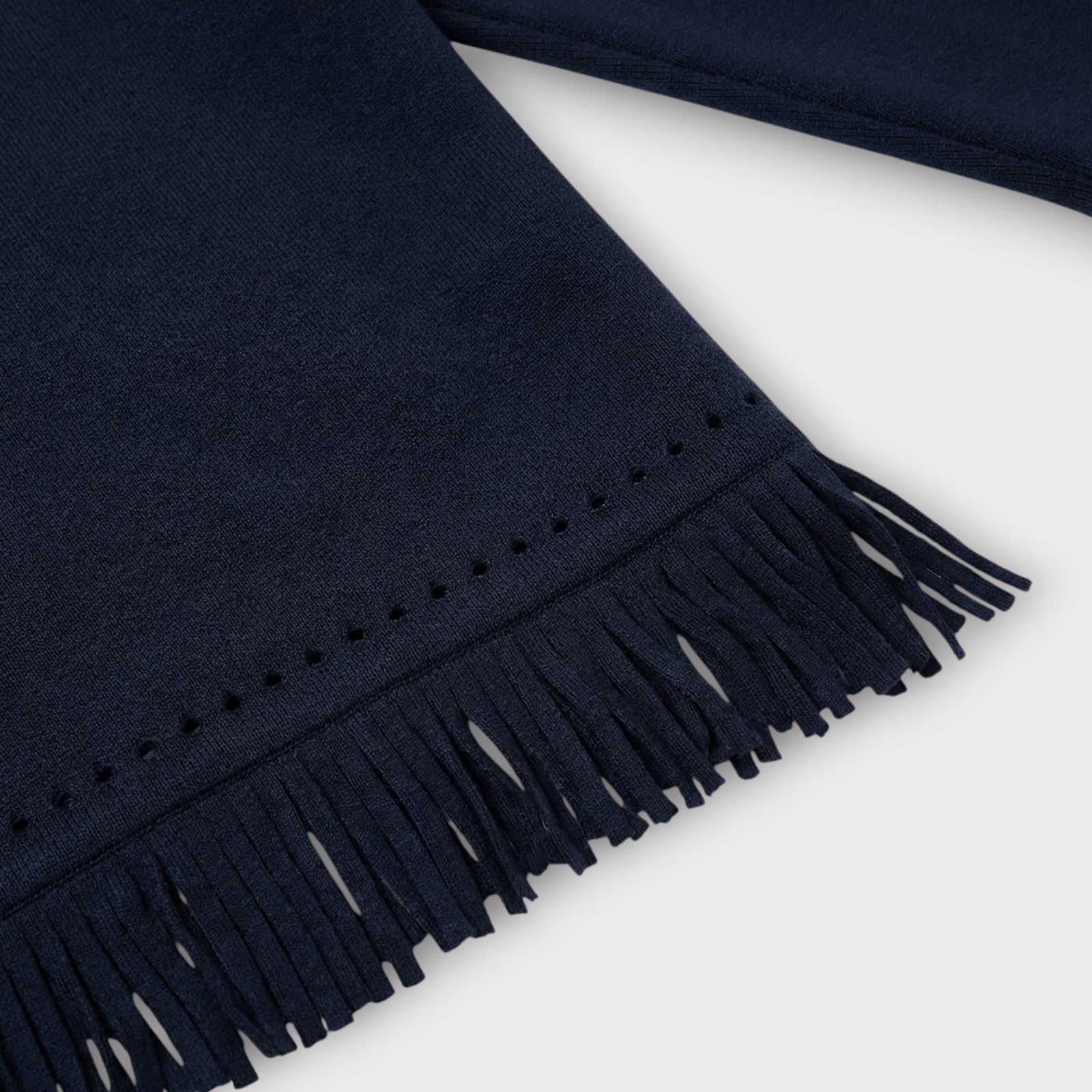 The Alaïa Spartre Fringe Cardigan in Navy is an elegant archival layering piece that combines the house’s signature precision knitwear with playful, tactile movement.