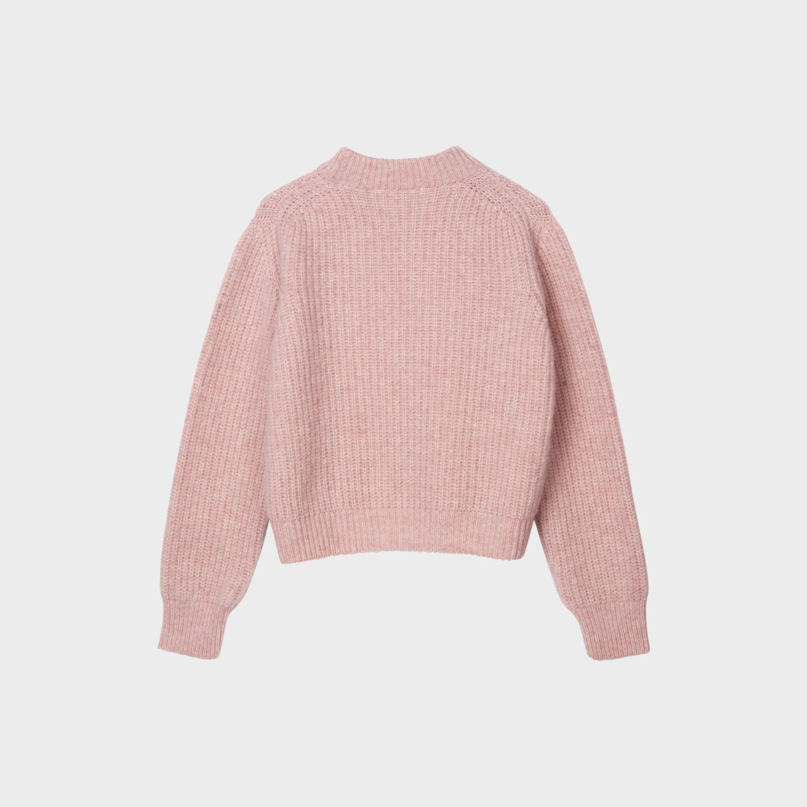 Cecilie Bahnsen Bega Wool Knit Pullover in Pink, spun from soft grey wool, the piece carries subtle volume through a boxy cropped fit and elongated sleeves. A delicate tonal floral appliqué sits near the hem.