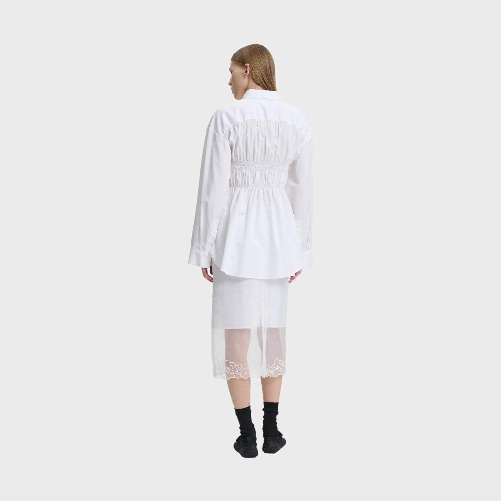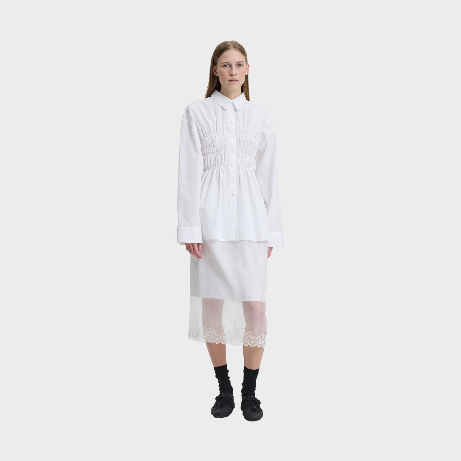 Cecilie Bahnsen Braxton Bodice Shirt is cut in crisp cotton poplin, its shirred bodice creates an architectural play between structure and softness — a modern interpretation of femininity in motion.