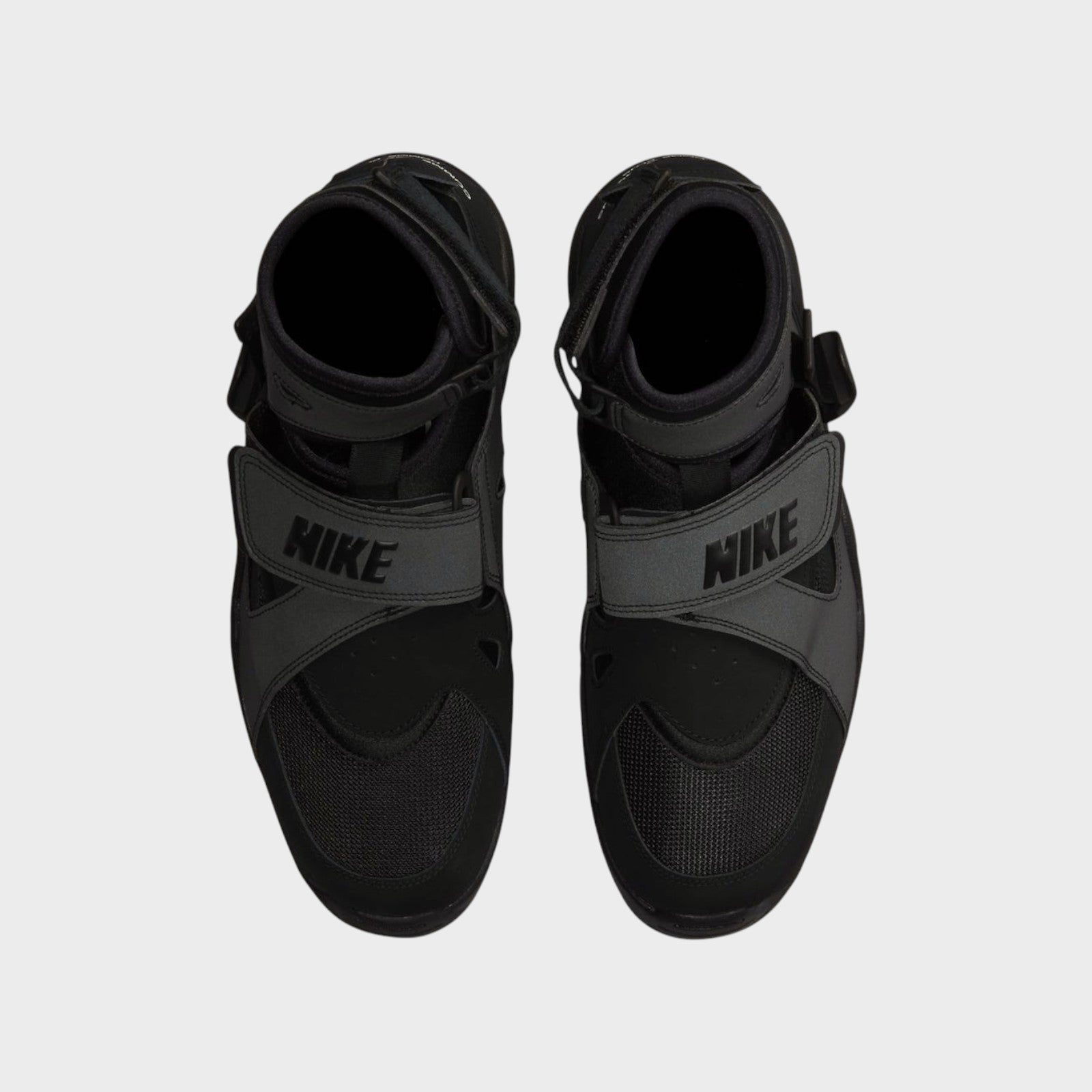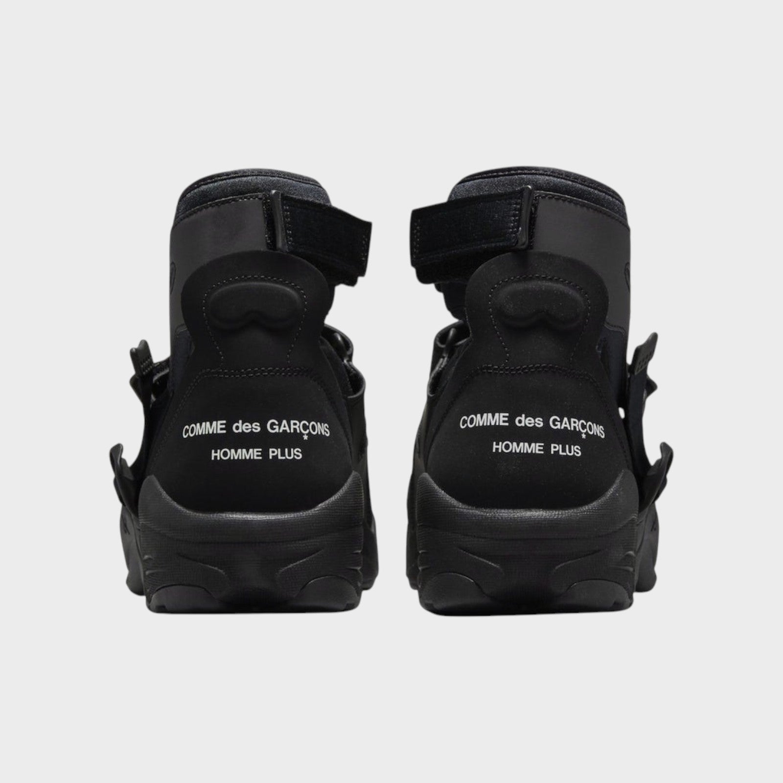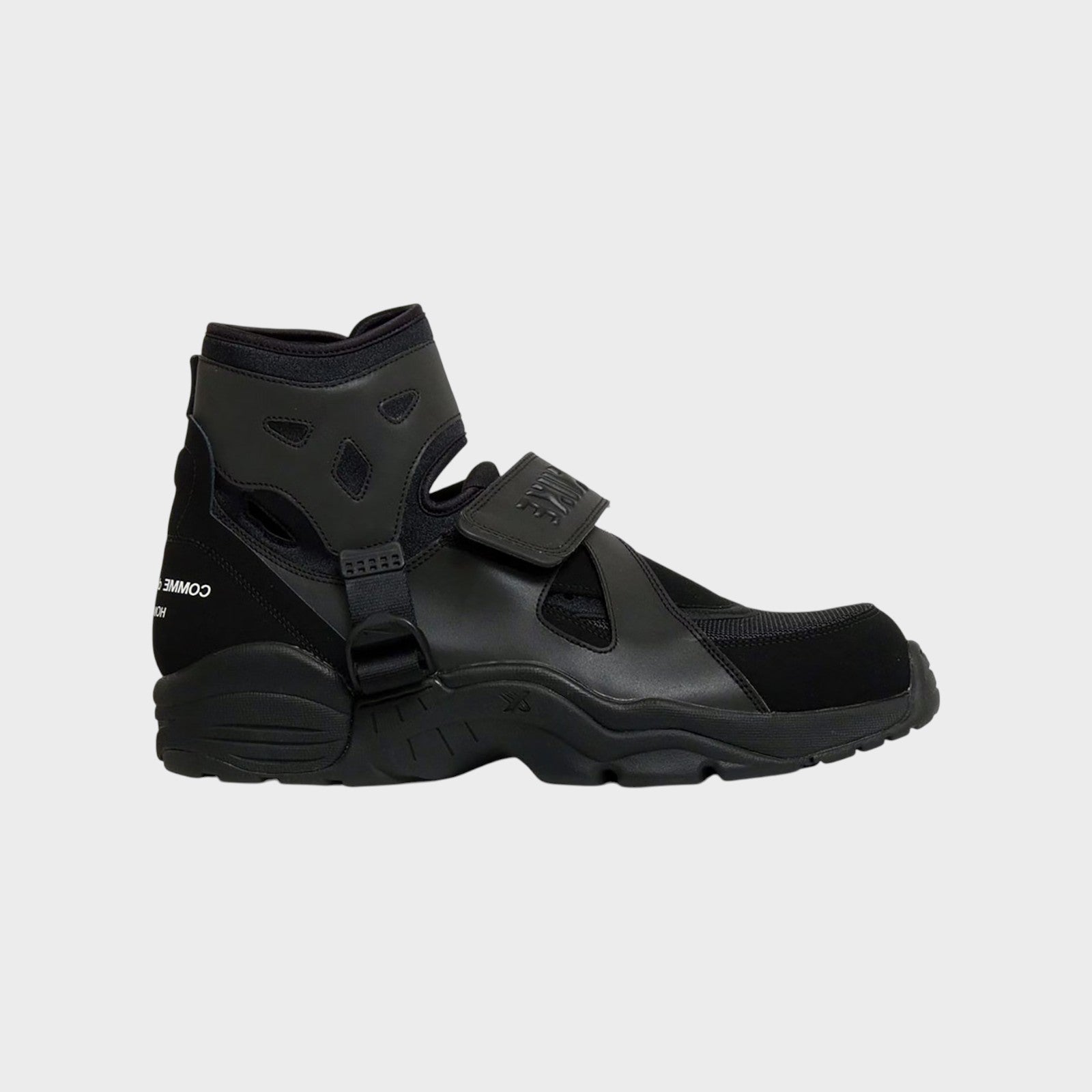 Comme des Garçons Homme Plus x Nike Air Carnivore, transforming the cult ’90s sneaker into a futuristic hybrid. Constructed in black leather and neoprene, the branded midfoot strap secures the fit and adds 3M reflective detailing