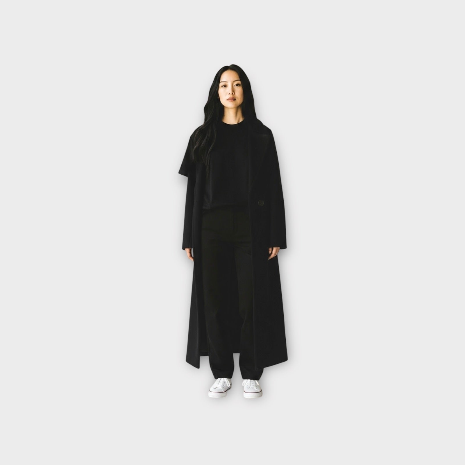 Jacquemus Oversized Wool Coat captures the brand’s signature tension between structure and sensuality. The cinched waist and voluminous hips echo architectural tailoring, while the pure wool fabrication adds depth and gravity to its midnight tone.