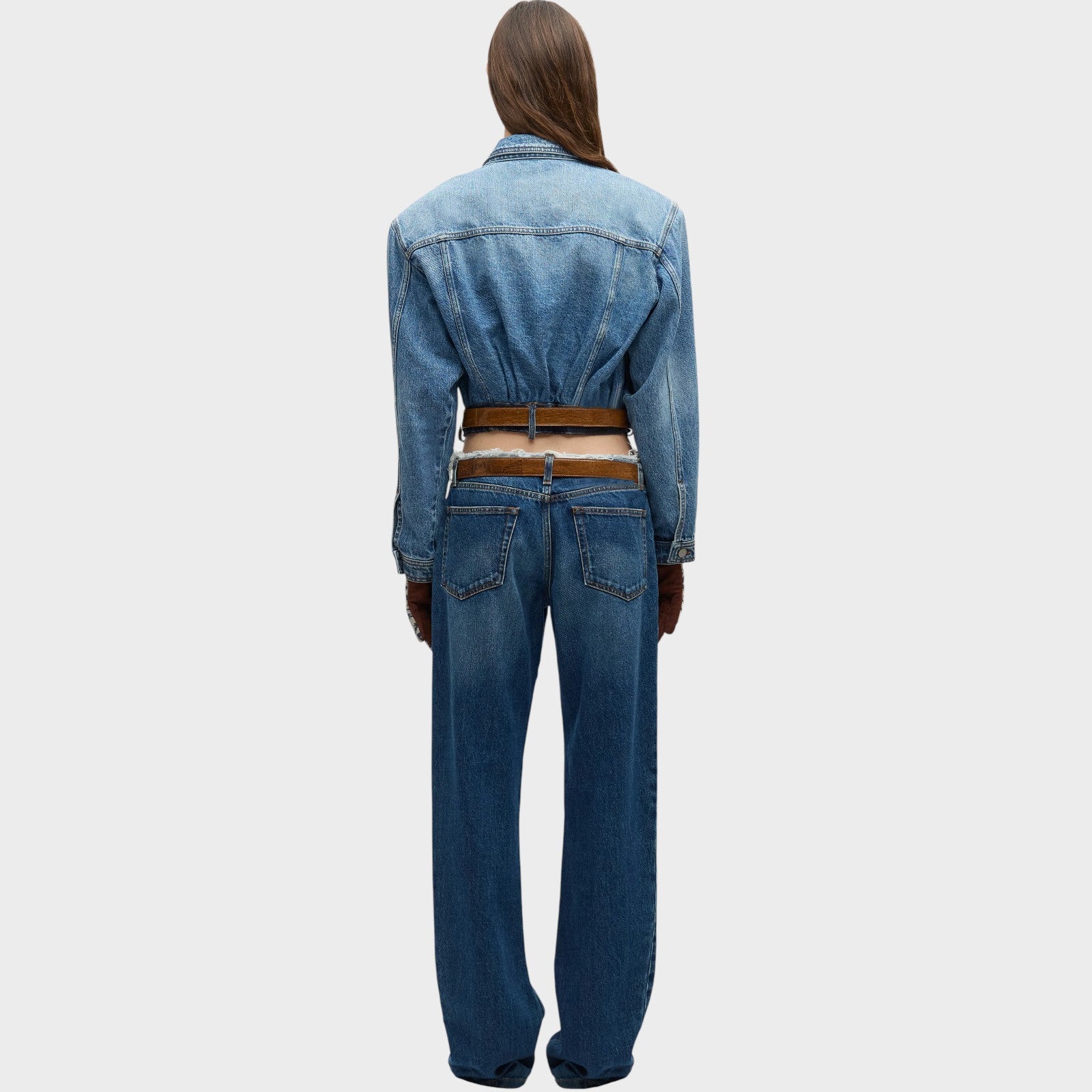 Julie Kegels Low Waist Denim Jeans sits slouched on the hips, held by a raw-cut waistband that deliberately reveals its frayed edge. A slim, faded leg elongates the body, while a slim leather belt grounds the design with utilitarian restraint.