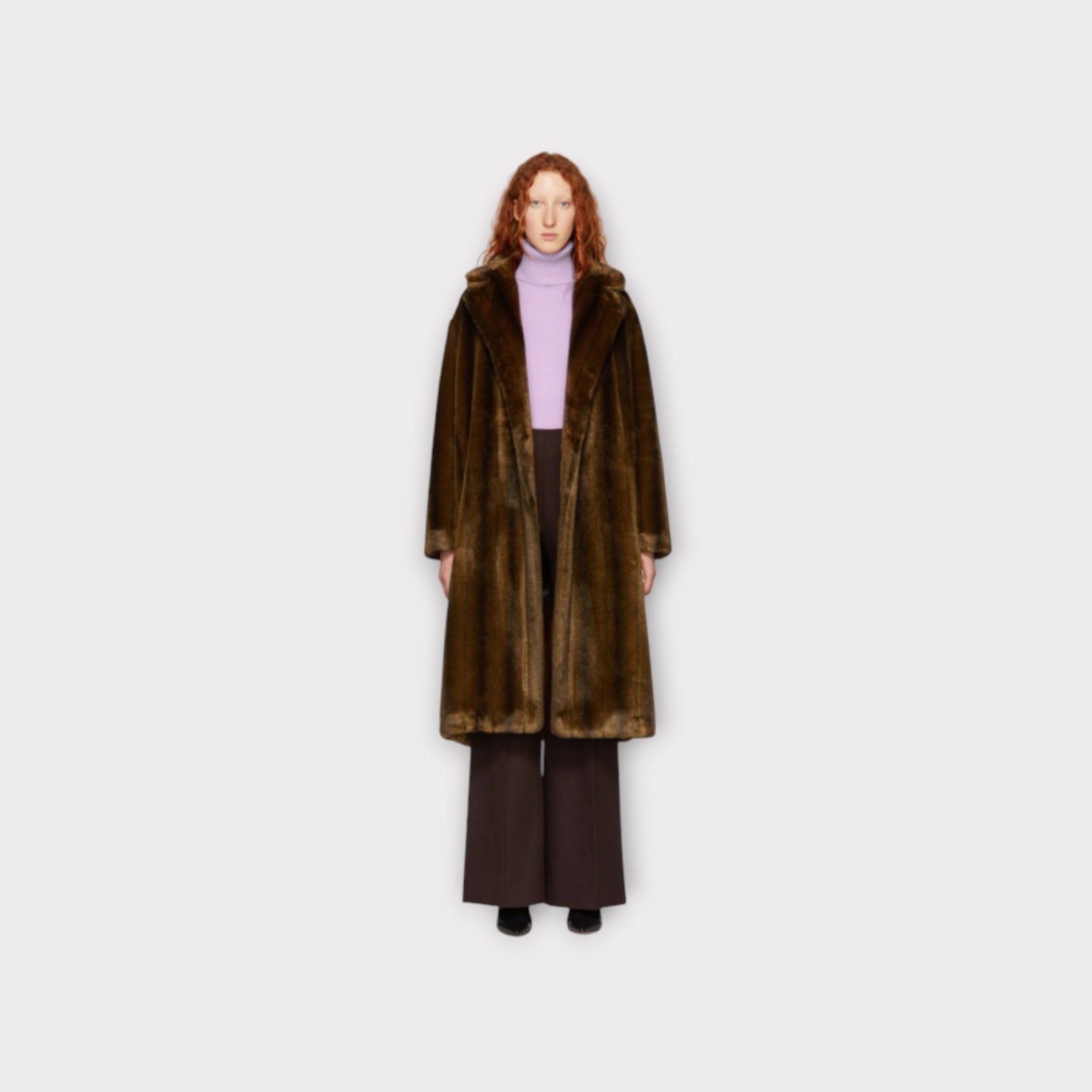 Kwaidan Editions Fake Fur Mink Robe balances the exaggerated drama of old-world glamour with the label’s precise, modern tailoring. Its deep brown faux fur, sculpted shoulders, and fluid robe silhouette create a tactile interplay between discipline and decadence.