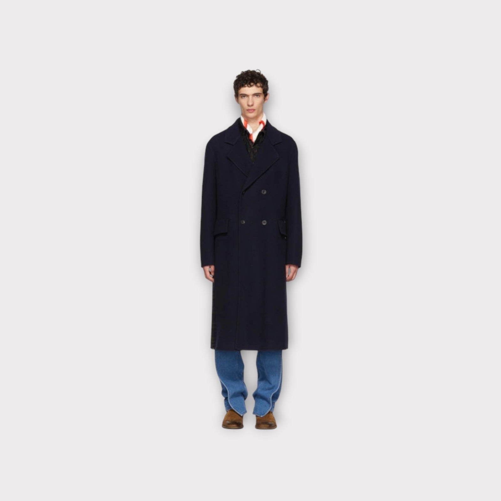 – Double-breasted long coat with tailored structure