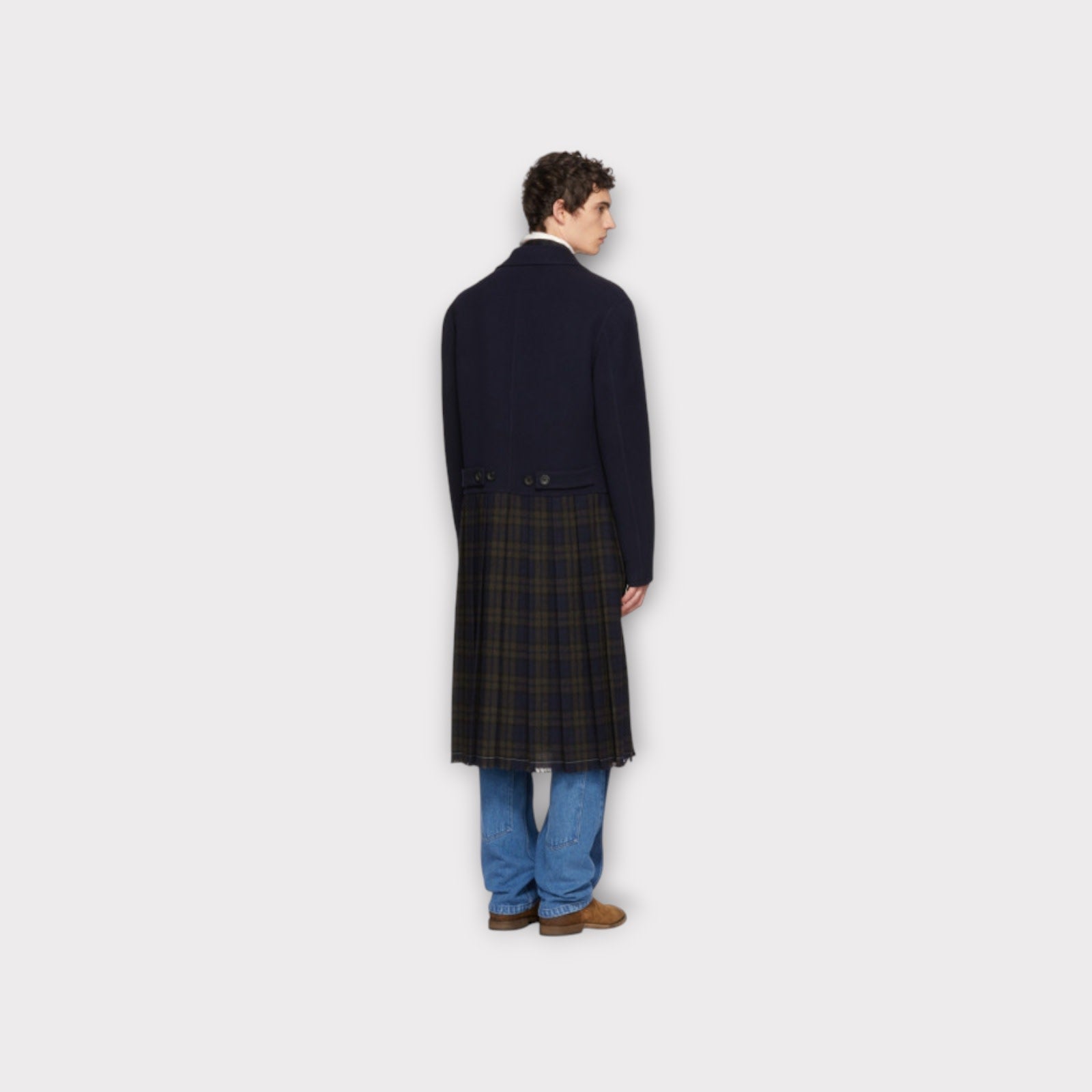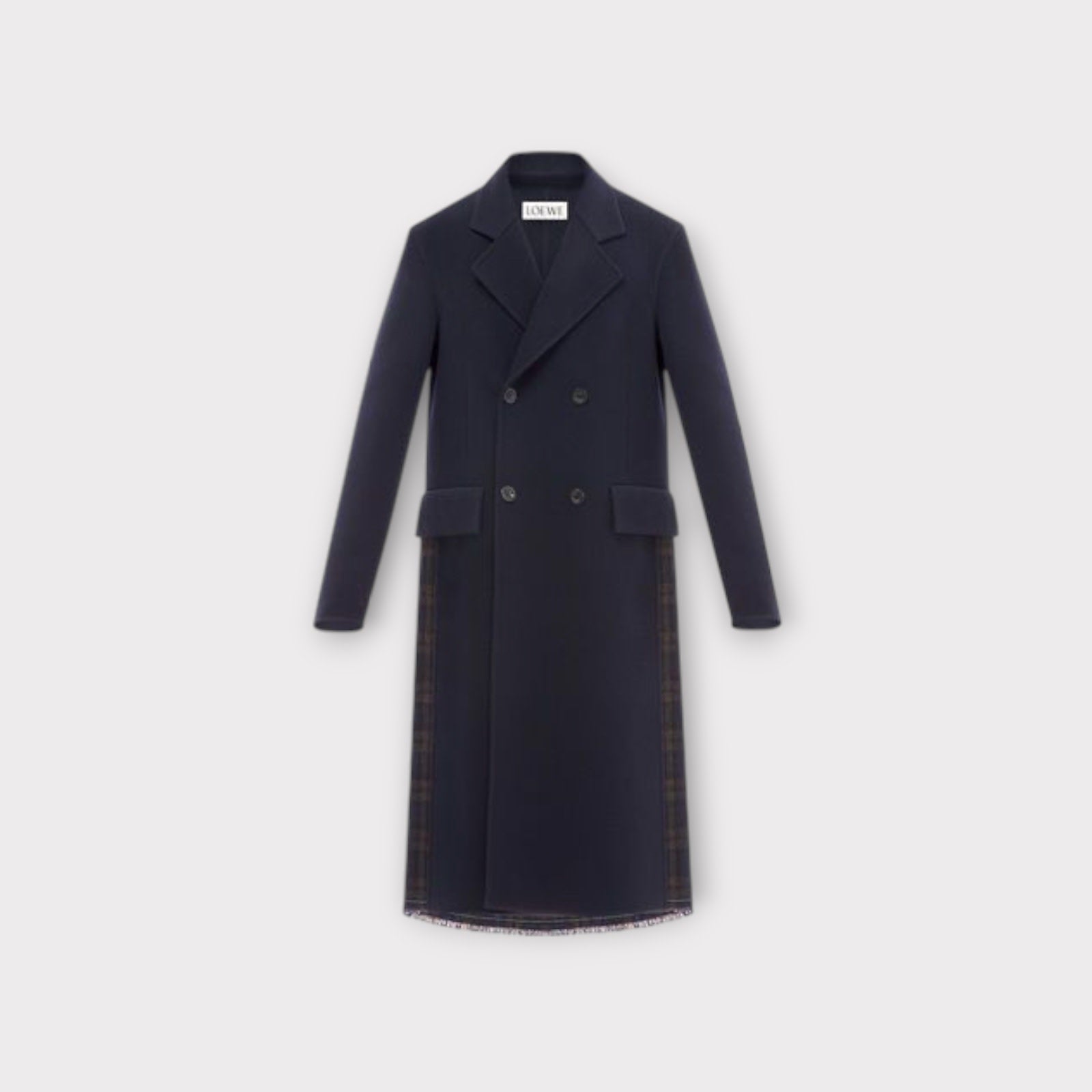 Loewe Checked Long Coat crafted in midnight wool, the silhouette maintains a structured front while revealing a pleated checked insert at the back, a quiet subversion of formal codes.