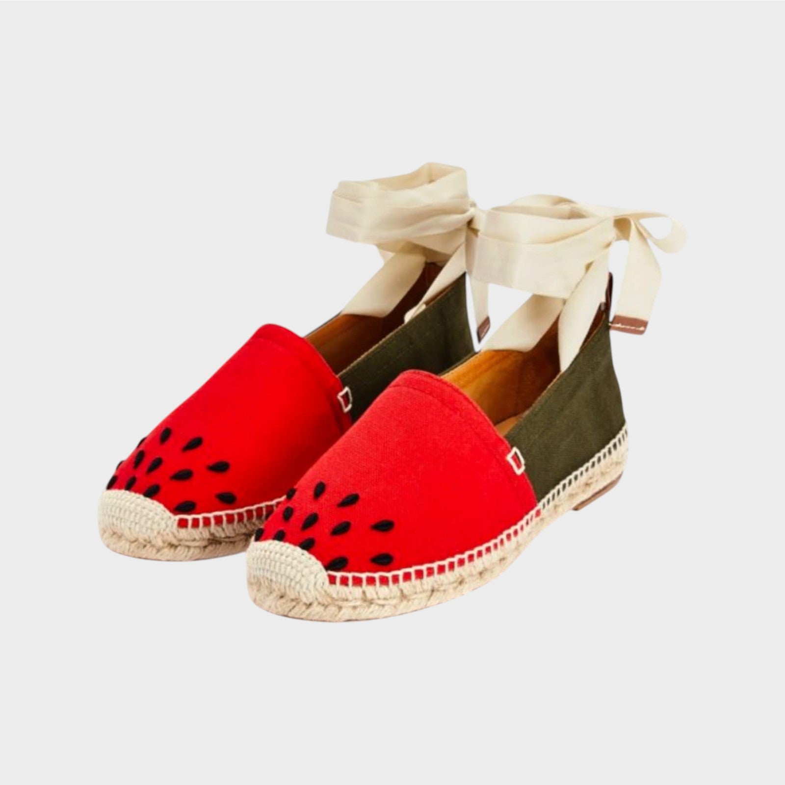 – Features a playful watermelon motif with a red vamp, black embroidered seeds, and a contrasting green heel.