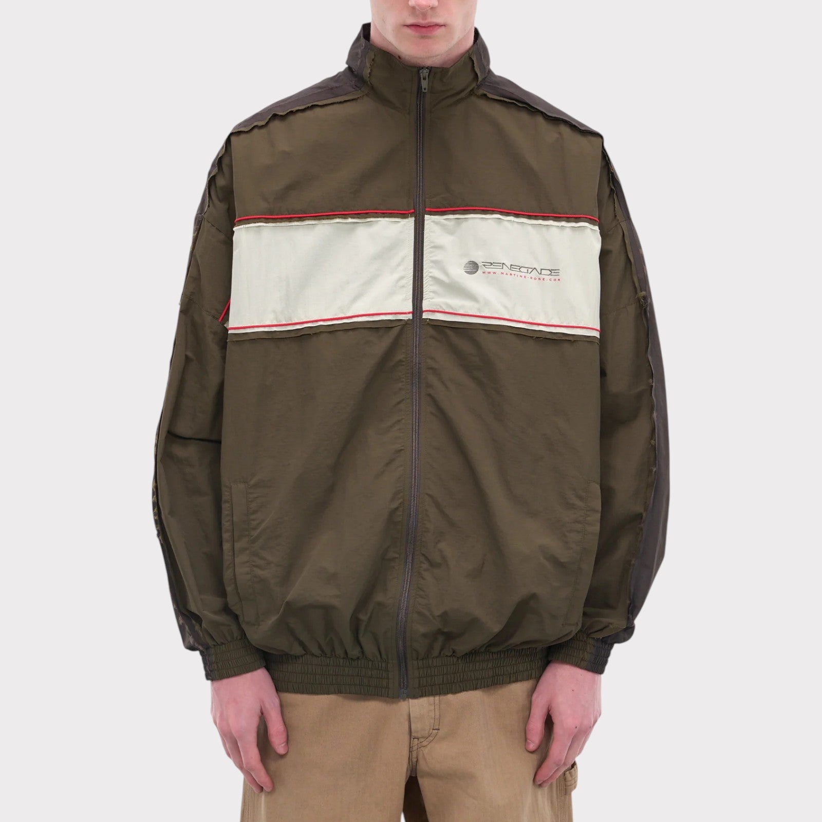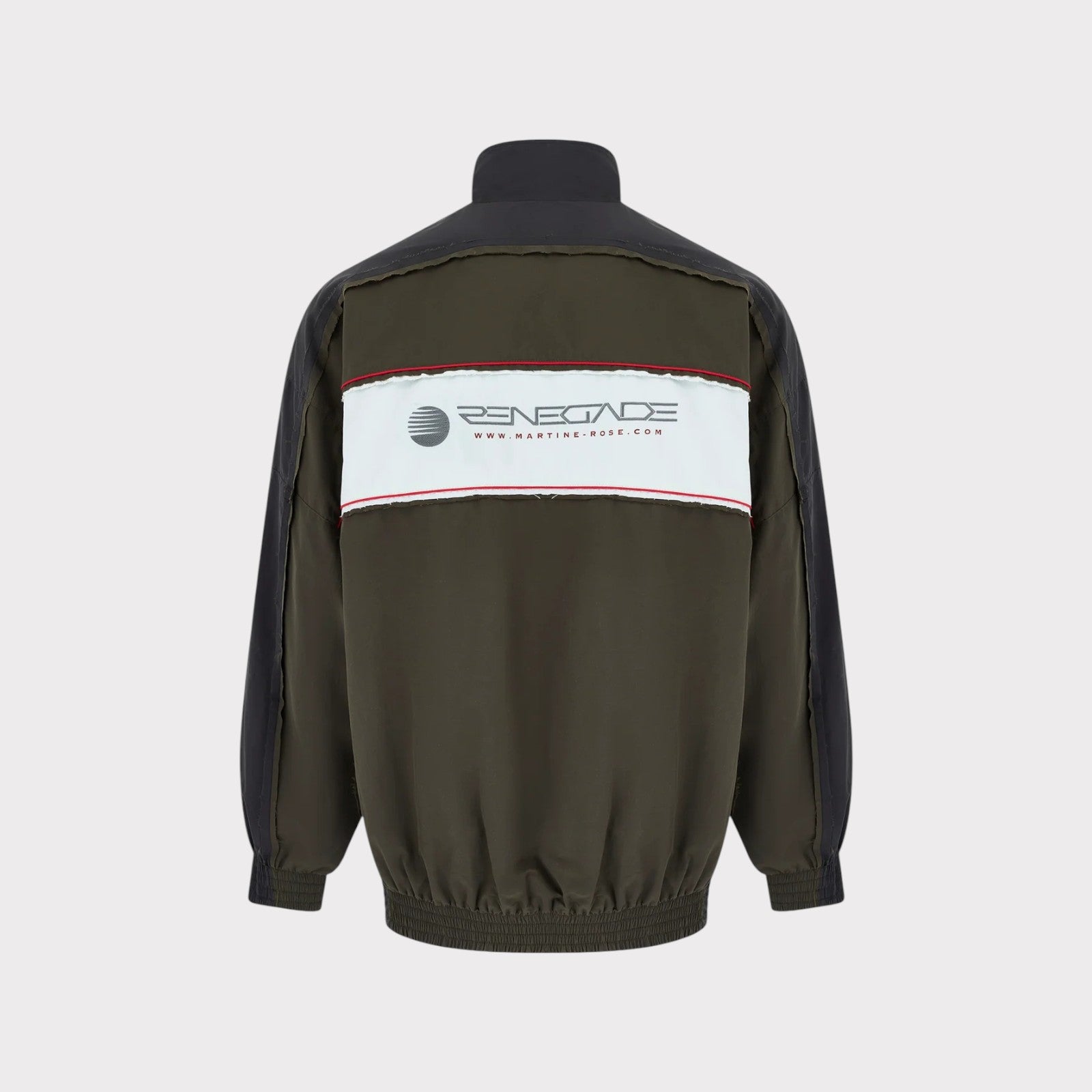 Martine Rose Layered Track Jacket with its dual-paneled construction, reflective stripe, and retro funnel neck, it channels 2000s athletic nostalgia through a distinctly London lens. The silhouette is oversized yet sharp—crafted for the rhythm of city streets and late-night movement.