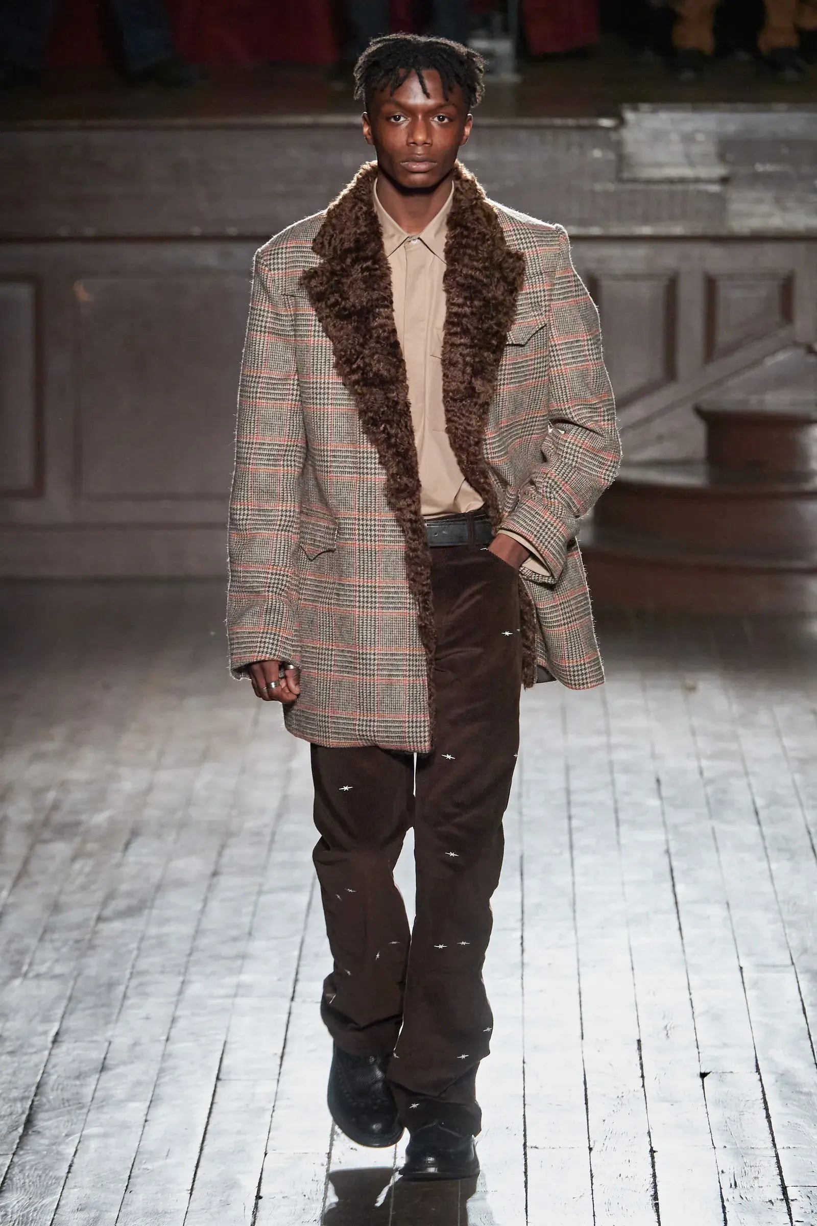 Phipps British Wool Coat merges heritage checks with a tactile faux-fur collar, capturing the tension between aristocratic formality and wild craftsmanship.